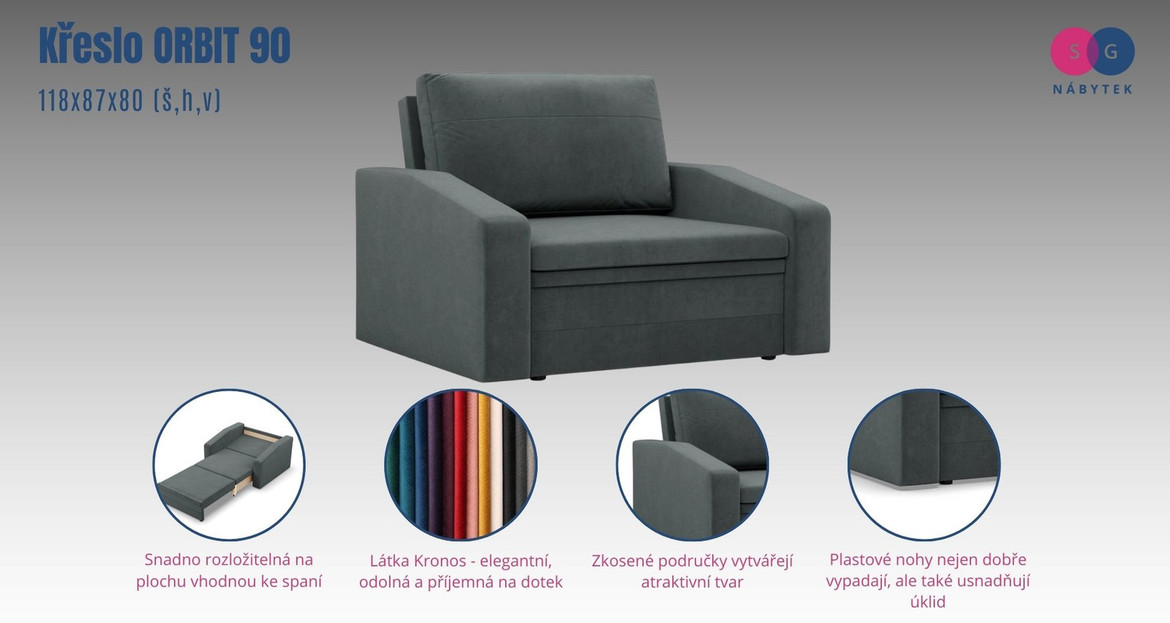 Křeslo ORBIT 90 je moderní a stylový kus nábytku, který byl navržen s ohledem na lidi kteří oceňují pohodlí a funkčnost. Je vyrobeno z pevných, vysoce kvalitních materiálů. Nohy jsou vyrobeny z plastu. Součástí křesla je úložný prostor.