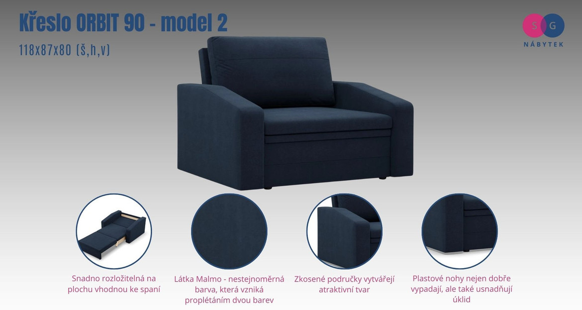 Křeslo ORBIT 90 je moderní a stylový kus nábytku, který byl navržen s ohledem na lidi kteří oceňují pohodlí a funkčnost. Je vyrobeno z pevných, vysoce kvalitních materiálů. Nohy jsou vyrobeny z plastu. Součástí křesla je úložný prostor.