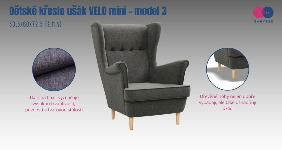 Dětské křeslo ušák VELO mini - model 3 Šedá