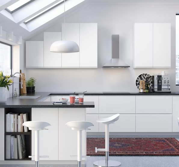 Co se týče kuchyňské linky, trendy jsou kuchyně, které tvoří bílé kuchyňské skříňky dolů nebo nahoře a v imitaci dřeva naopak (dolů nebo nahoře).