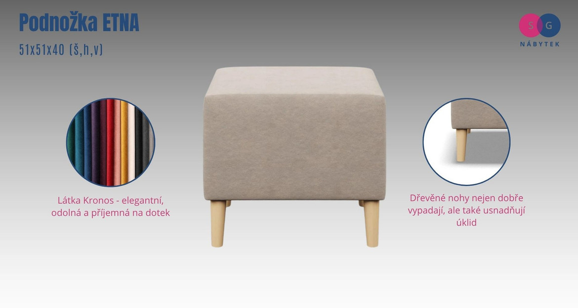 Kvalitní čalouněná podnožka ETNA - Kronos 50x50 cm je vyrobena z pevných, vysoce kvalitních materiálů. Nohy jsou vyrobeny ze dřeva.