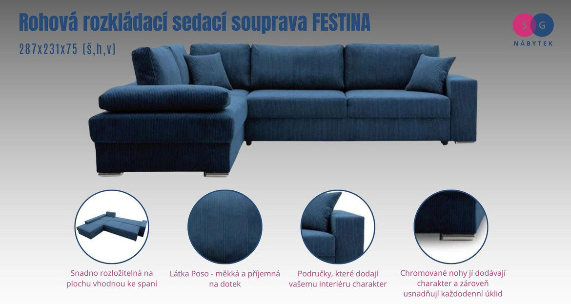 Pevná konstrukce ze dřeva a OSB desky. Potah z kvalitní látky POSO v mnoha moderních barevných odstínech. Snadné rozkládání na lůžkovou podobu. Moderní design vhodný do všech současných interiérů.