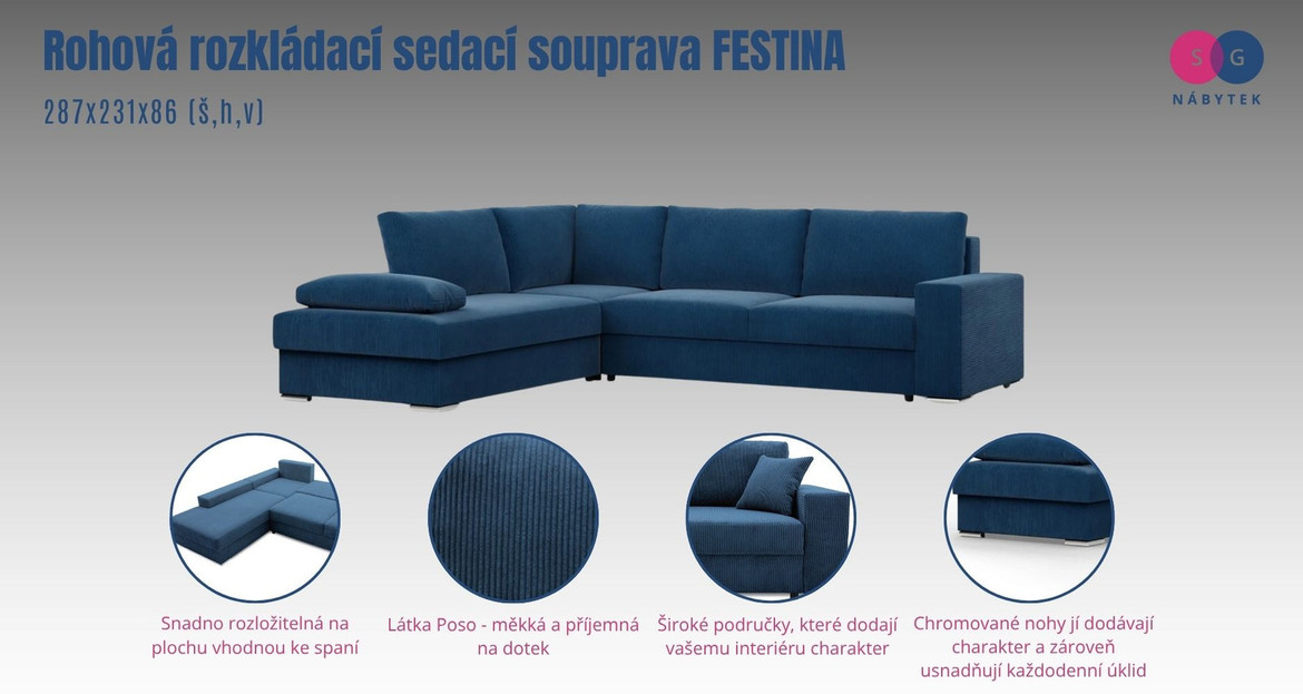 Pevná konstrukce ze dřeva a OSB desky. Potah z kvalitní látky POSO v mnoha moderních barevných odstínech. Snadné rozkládání na lůžkovou podobu. Moderní design vhodný do všech současných interiérů.