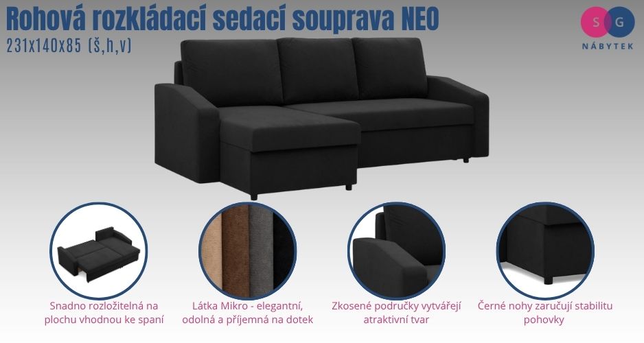 Sedací souprava NEO je moderní a stylový kus nábytku, který byl navržen s ohledem na lidi kteří oceňují pohodlí a funkčnost. Je vyrobena z pevných, vysoce kvalitních materiálů. Nohy jsou vyrobeny z plastu.