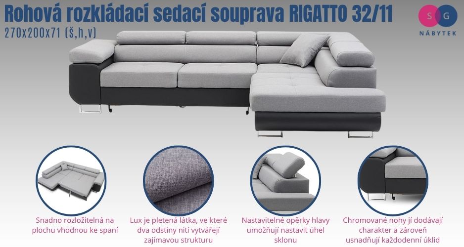 Rohová rozkládací sedací souprava Rigatto 32/11. Pevná konstrukce ze dřeva a OSB desky. Potah z kvalitní eko-kůže a tkaniny. Nastavitelné opěrky hlavy umožňují nastavit úhel sklonu ve vztahu ke krku a hlavě uživatele, což poskytuje dodatečnou podporu a zároveň maximální pohodlí . Pochromované efektní nožičky usnadní úklid a  systém rozkládání typu delfín rychle a snadno promění sedací soupravu na lůžko. Moderní design vhodný do všech současných interiérů.