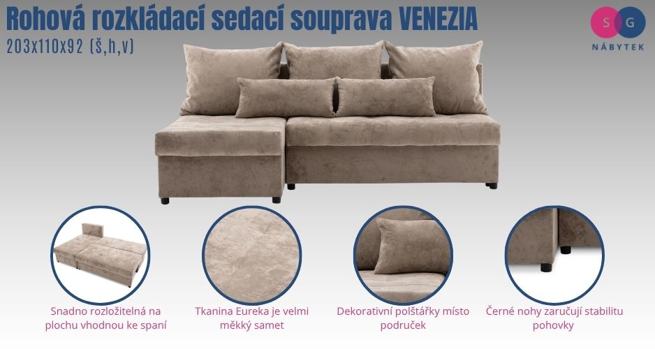 Rohová rozkládací sedací souprava VENEZIA potěší svou elegancí a funkčností.