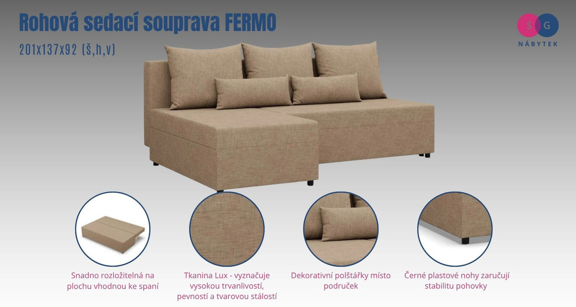 Pevná konstrukce ze dřeva a OSB desky. Potah z kvalitní látky LUX v mnoha moderních barevných odstínech. Snadné rozkládání sedací soupravy na lůžkovou podobu. Moderní design vhodný do všech současných interiérů.