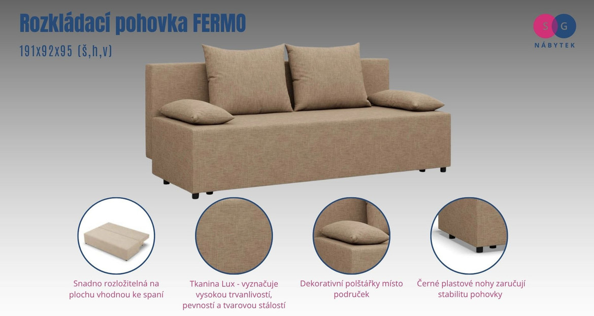 Pevná konstrukce ze dřeva a OSB desky. Potah z kvalitní látky LUX v mnoha moderních barevných odstínech. Snadné rozkládání pohovky na lůžkovou podobu. Moderní design vhodný do všech současných interiérů.