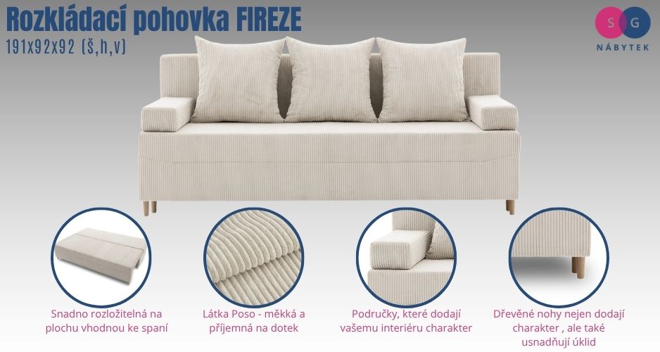 Pevná konstrukce ze dřeva a OSB desky. Potah z kvalitní látky Poso v moderních barevných odstínech. Snadné rozkládání pohovky na lůžkovou podobu. Moderní skandinávský design vhodný do všech současných interiérů. Součástí pohovky je úložný prostor.