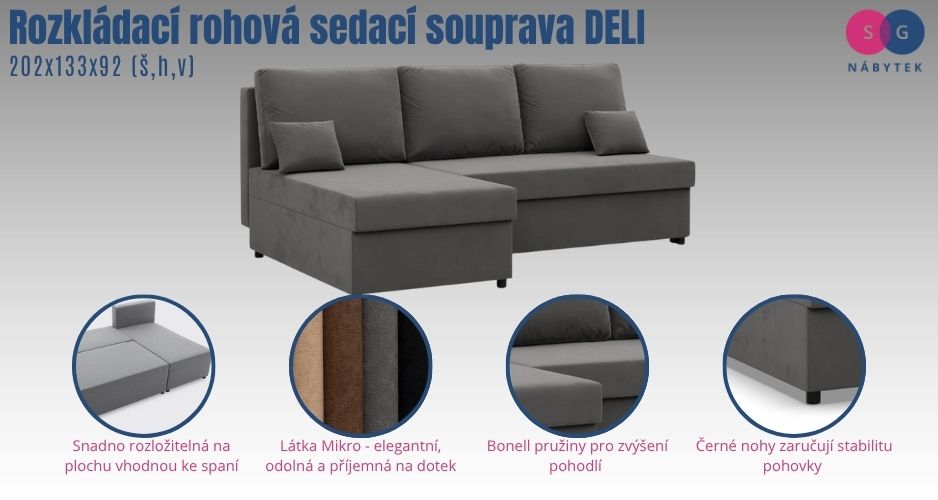 Pevná konstrukce ze dřeva a OSB desky. Potah z kvalitní látky Micro v mnoha moderních barevných odstínech. Snadné rozkládání pohovky na lůžkovou podobu. Moderní design vhodný do všech současných interiérů.