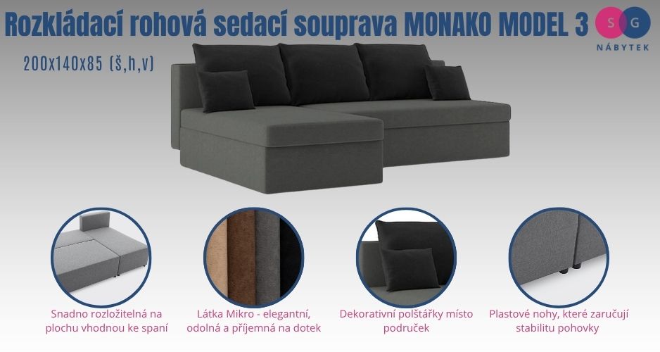 Rohová rozkládací sedací souprava Monako Model 2. Pevná konstrukce ze dřeva a OSB desky. Potah z kvalitní látky VELUR - MICRO v mnoha moderních barevných odstínech. Snadné rozkládání pohovky na lůžkovou podobu.