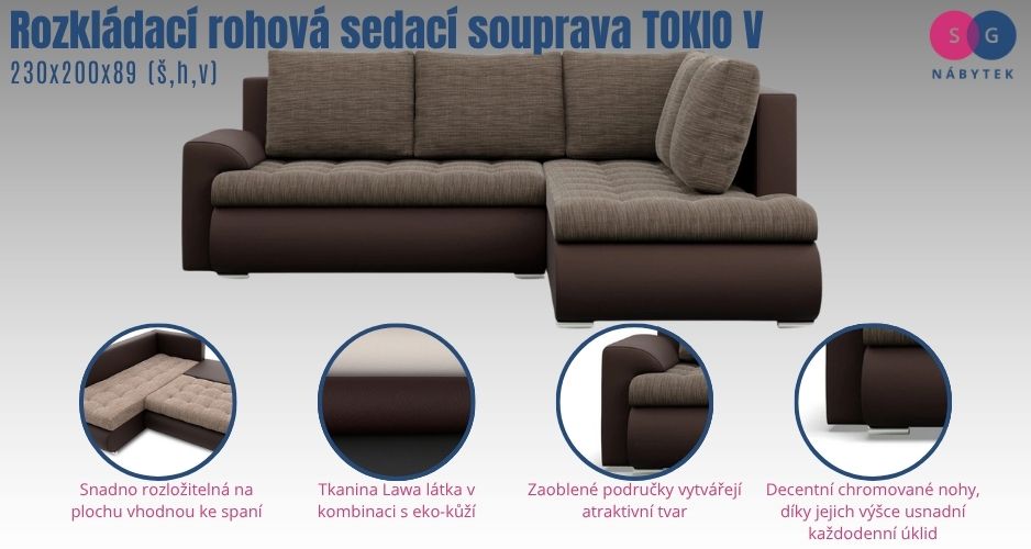 Pevná konstrukce ze dřeva a OSB desky. Potah z kvalitní tkaniny v mnoha moderních barevných odstínech. Sedací část je prošívaná. Snadné rozkládání sedací soupravy na lůžkovou podobu. Moderní design vhodný do všech současných interiérů.