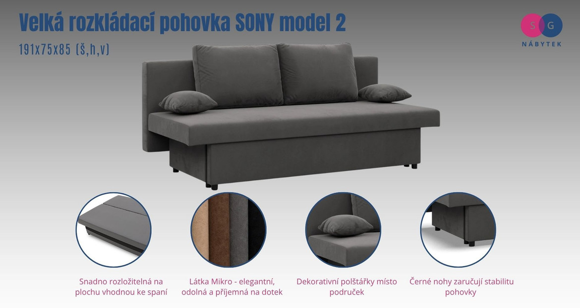 Pevná konstrukce ze dřeva a OSB desky. Potah z kvalitní látky Haiti v mnoha moderních barevných odstínech. Snadné rozkládání pohovky na lůžkovou podobu. Moderní design vhodný do všech současných interiérů.