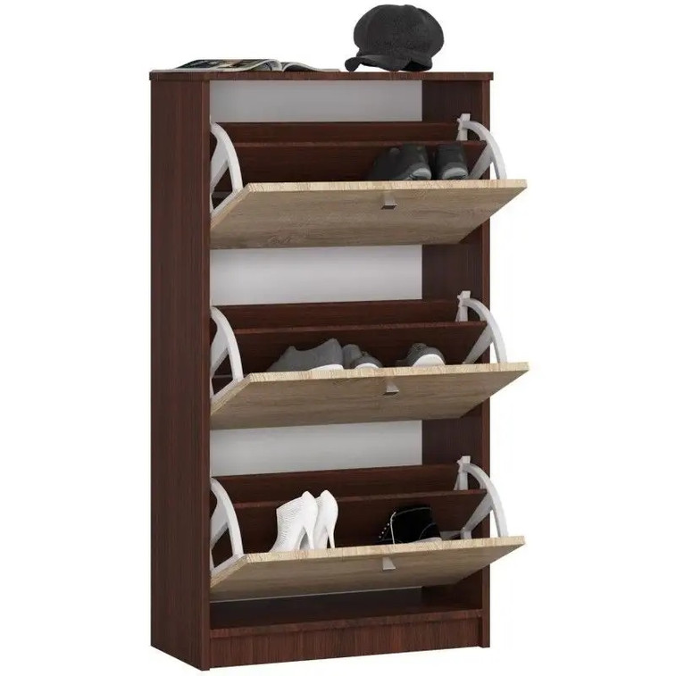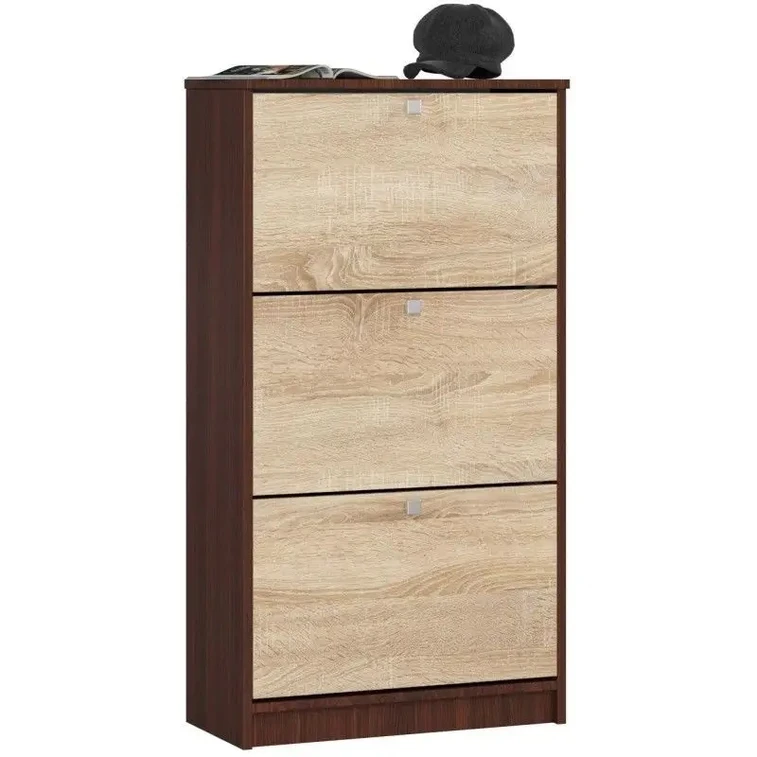 Botník se třemi dvířky je funkční botník, který lze použít v každé domácnosti. Vytvoříte sním funkční, reprezentativní uvítací prostor. Za výklopnými dvířky najdete úložný prostor, do kterého můžete uskladnit několik párů bot. Hodí se nejen do domácnosti, ale i do hotelů, penzionů a kanceláří.