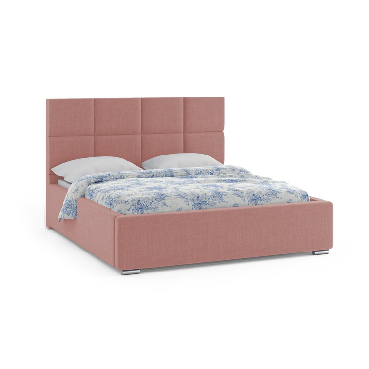 Luxusní dvoulůžková čalouněná postel s vysokým čelem a úložným prostorem.
