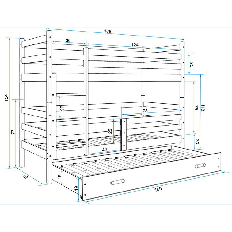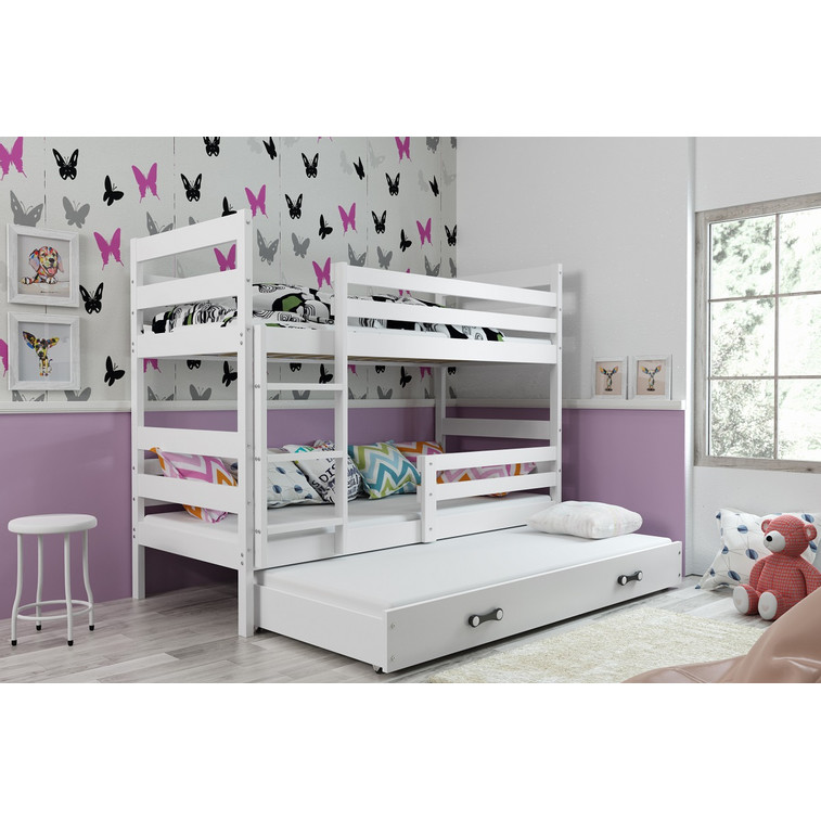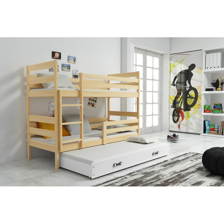 Patrová postel Eryk s výsuvnou postelí, rozměr 160x80 cm, znamená rychlé řešení nedostatku místa pro početné rodiny. Jedná se o kompletní sestavu: POSTEL + 3x MATRACE + 3x ROŠT. Také se potýkáte s tím, kam uložit všechny děti, když v bytě máte jenom jeden pokojíček? Tahle varianta postele je pro vás tou správnou volbou. Je vhodná pro kluky i pro holky a navíc si s ní užijí spoustu legrace. Patrová postel odjakživa byla snem každého dítěte a vy máte nyní možnost jej vašim ratolestím splnit. Tato postel dokáže rozzářit nejen interiér pokoje, ale i dětskou tvář.