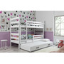 Patrová postel Eryk s výsuvnou postelí, rozměr 190x80 cm,  znamená rychlé řešení nedostatku místa pro početné rodiny. Jedná se o kompletní sestavu: POSTEL + 3x MATRACE + 3x ROŠT. Také se potýkáte s tím, kam uložit všechny děti, když v bytě máte jenom jeden pokojíček? Tahle varianta postele je pro vás tou správnou volbou. Je vhodná pro kluky i pro holky a navíc si s ní užijí spoustu legrace. Patrová postel odjakživa byla snem každého dítěte a vy máte nyní možnost jej vašim ratolestím splnit. Tato postel dokáže rozzářit nejen interiér pokoje, ale i dětskou tvář.