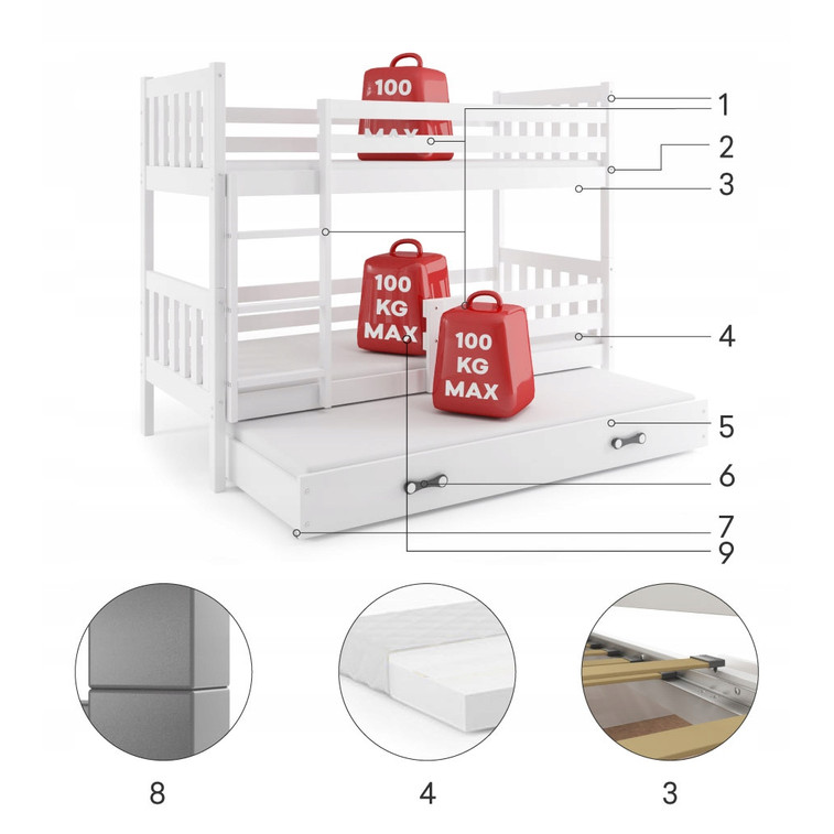 Dětská patrová postel Carino s výsuvným lůžkem včetně matrací a roštů. Postel obsahuje ochrannou zábranu. S ohledem na děti je veškerý sortiment vyroben ekologicky. Je tedy vyloučeno při kontaktu dítěte s nábytkem požití toxických nebo zdraví škodlivých látek. Žebřík lze namontovat vpravo i vlevo.