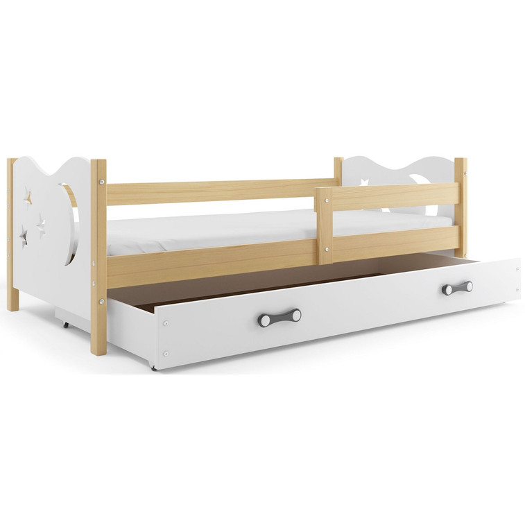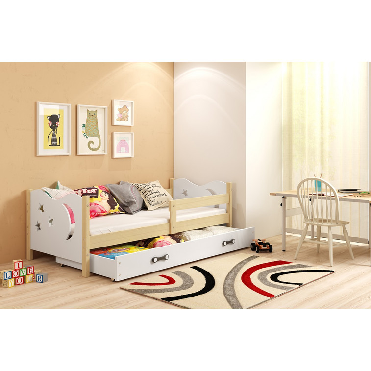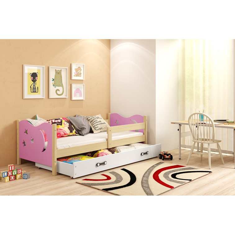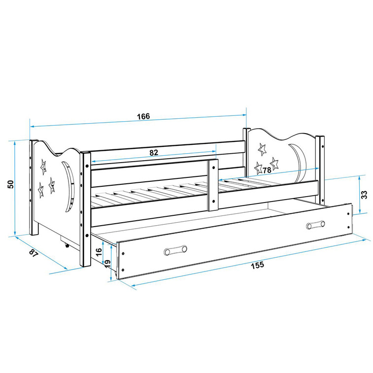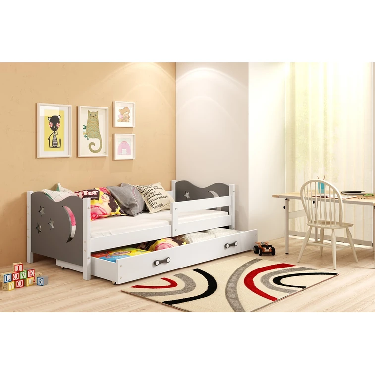 Dětská postel se zábranou, která obsahuje matraci, rošt a úložný prostor. Idealní volba do dětského pokoje, díky zábraně ochrání Vaše dítě proti možným pádům z postele.