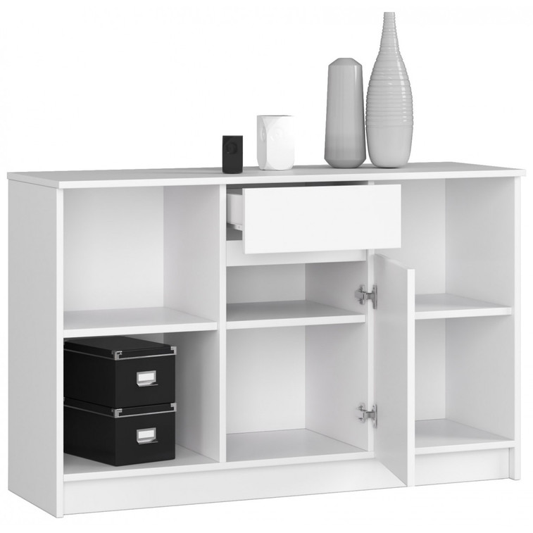 Komoda B-17 120 cm má moderní vzhled. Je velká, prostorná a funkční. Komoda je oblíbeným kusem nábytku, zejména v místnostech, jako je obývací pokoj, nebo ložnice. Komoda má jednoduchý tvar a univerzální charakter, takže se skvěle hodí do místností, s různými dekory a uspořádáními.