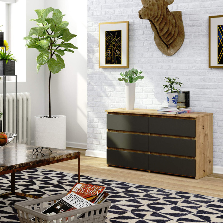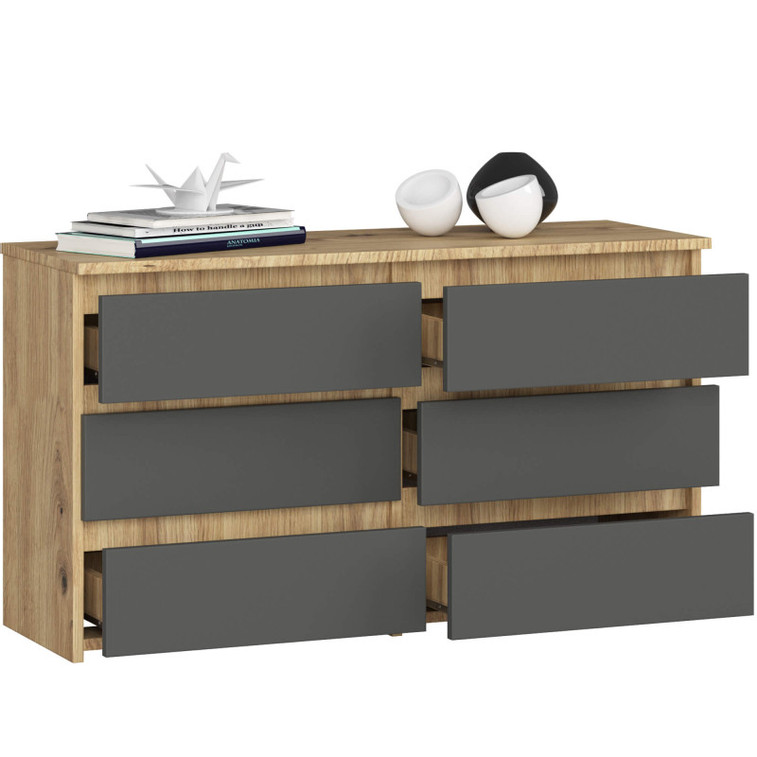 Jednoduchá a moderní komoda. Je vyrobená z pevné laminované desky, která je odolná proti oděru a poškození. Univerzální vzhled splní očekávání každého, kdo ocení kombinaci jednoduchosti a elegance. Bezúchytková čela zásuvek zajišťují pohodlné používání.