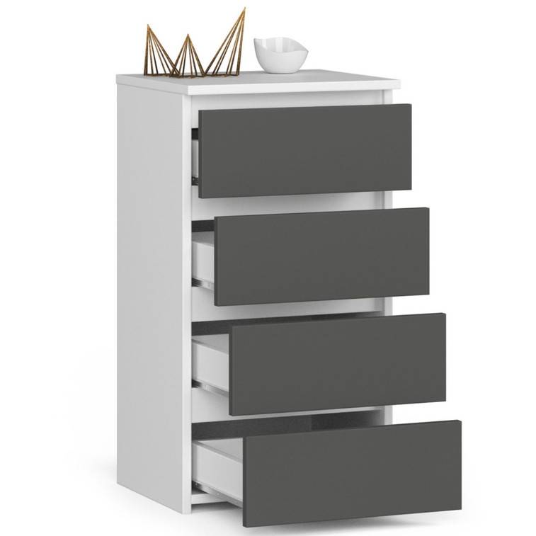 Jednoduchá a moderní komoda. Je vyrobená z pevné laminované desky, která je odolná proti oděru a poškození. Univerzální vzhled splní očekávání každého, kdo ocení kombinaci jednoduchosti a elegance. Bezúchytková čela zásuvek a dvířek zajišťují pohodlné používání.