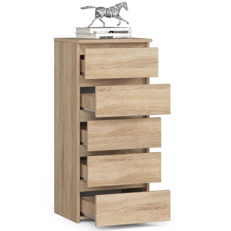 Jednoduchá a moderní komoda. Je vyrobená z pevné laminované desky, která je odolná proti oděru a poškození. Univerzální vzhled splní očekávání každého, kdo ocení kombinaci jednoduchosti a elegance. Bezúchytková čela zásuvek zajišťují pohodlné používání.