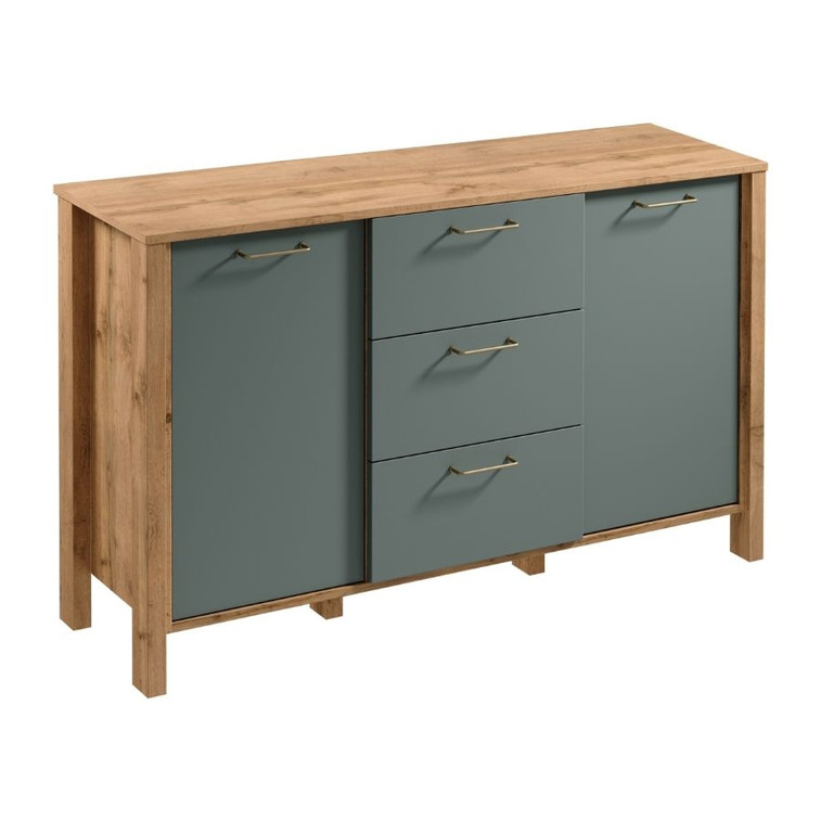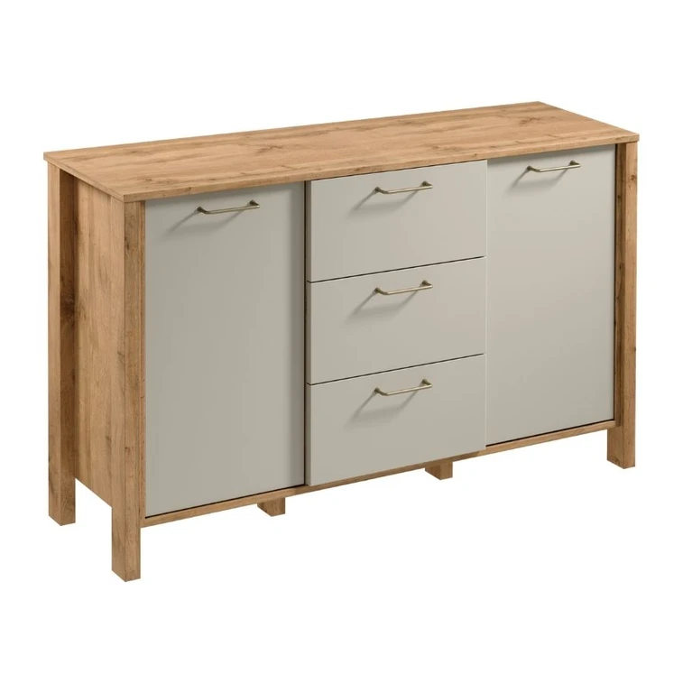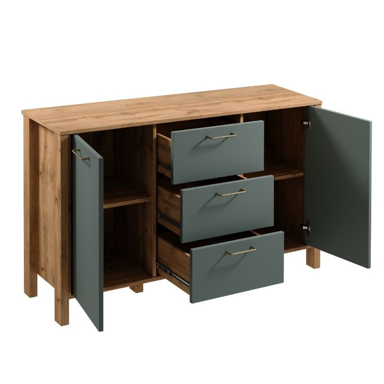Komoda K2D3S se skvěle hodí na drobnosti a dokumenty. Zásuvky mají funkci plného výsuvu, což výrazně usnadňuje přístup k předmětům uvnitř. Dvě prostorné skříně s poličkou nabízející další úložný prostor. Vysoké nohy umožňují snadný přístup. Kovové rukojeti v matně zlaté barvě dodávají eleganci. Přírodní barvy teplého dekoru dub Wotan na korpusu nábytku v kombinaci s jednobarevnou béžovou nebo zelenou na výběr dělají kolekci přirozeně krásnou.