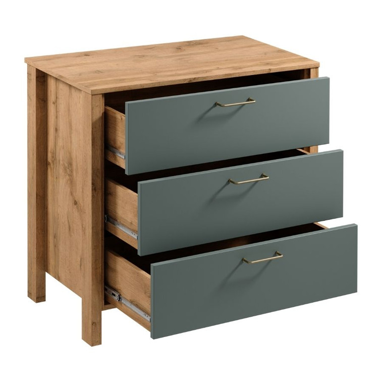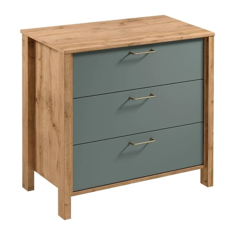 Komoda K3S se třemi prostornými, plnovýsuvnými zásuvkami, což výrazně usnadňuje přístup k věcem uvnitř. Povrch pracovní desky umožňuje vystavit dekorace. Kovové rukojeti v matně zlaté barvě dodávají eleganci. Přírodní barvy teplého dekoru dub Wotan na korpusu nábytku v kombinaci s jednobarevnou béžovou nebo zelenou na výběr dělají kolekci přirozeně krásnou.