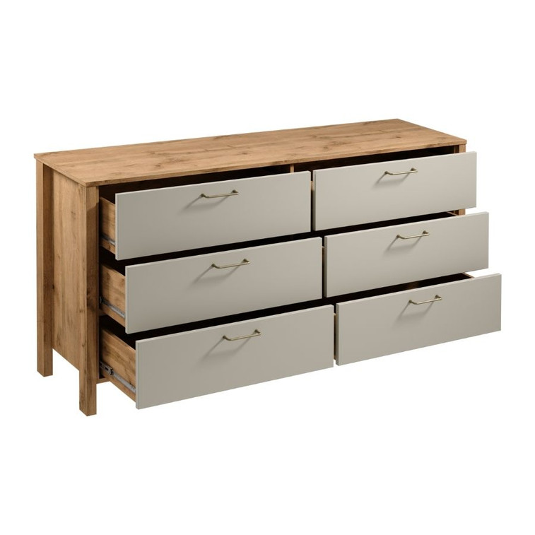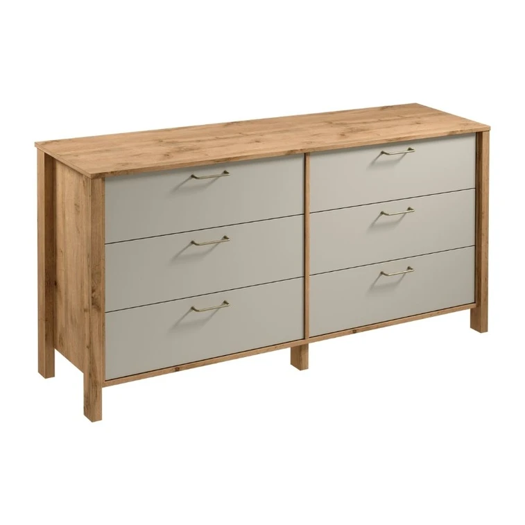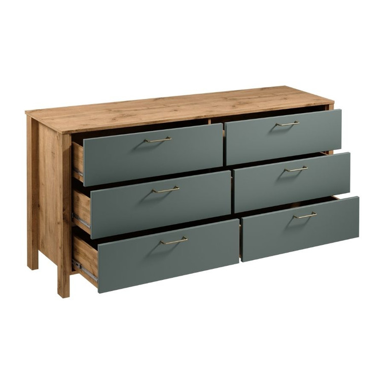 Komoda K6S se šesti prostornými, plnovýsuvnými zásuvkami, což výrazně usnadňuje přístup k věcem uvnitř. Povrch pracovní desky umožňuje vystavit dekorace. Kovové rukojeti v matně zlaté barvě dodávají eleganci. Přírodní barvy teplého dekoru dub Wotan na korpusu nábytku v kombinaci s jednobarevnou béžovou nebo zelenou na výběr dělají kolekci přirozeně krásnou.