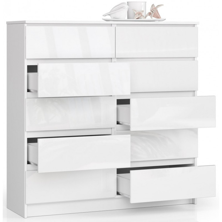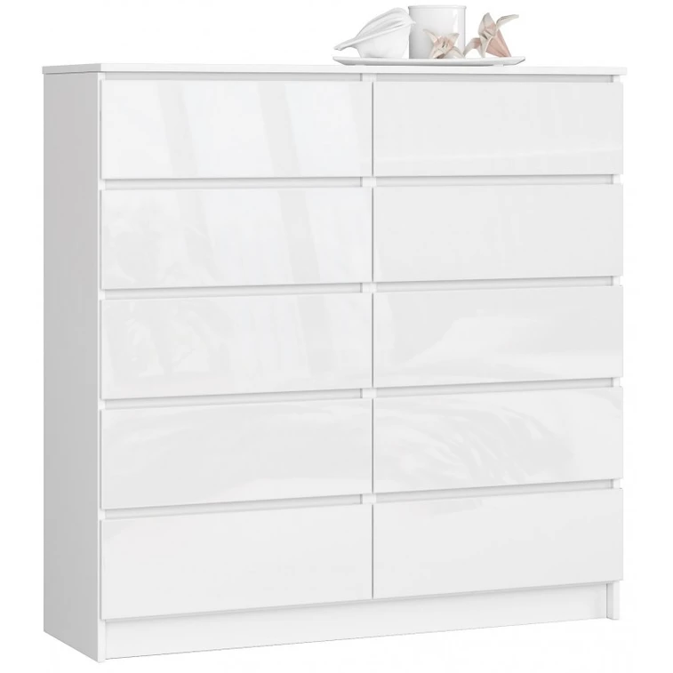Jednoduchá a moderní komoda K120 10SZ. Je vyrobená z pevné laminované desky, která je odolná proti oděru a poškození. Univerzální vzhled splní očekávání každého, kdo ocení kombinaci jednoduchosti a elegance. Bezúchytková čela zásuvek zajišťují pohodlné používání.