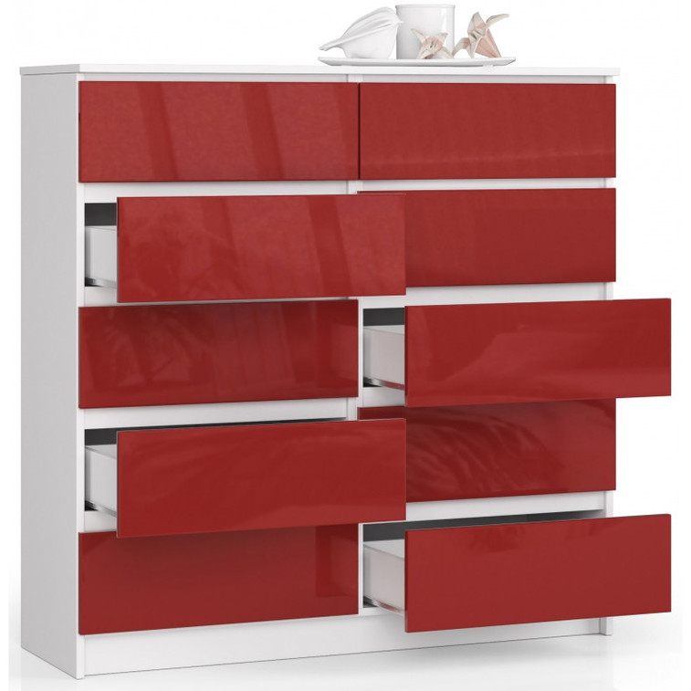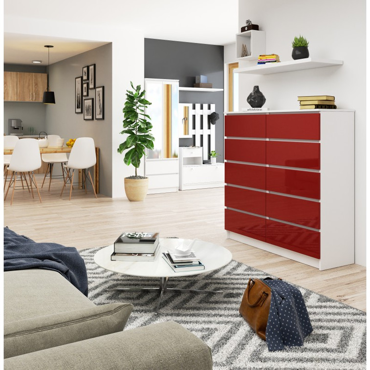 Jednoduchá a moderní komoda K120 10SZ. Je vyrobená z pevné laminované desky, která je odolná proti oděru a poškození. Univerzální vzhled splní očekávání každého, kdo ocení kombinaci jednoduchosti a elegance. Bezúchytková čela zásuvek zajišťují pohodlné používání.