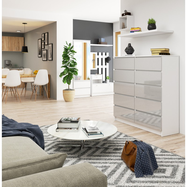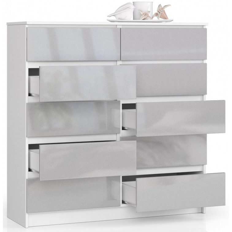 Jednoduchá a moderní komoda K120 10SZ. Je vyrobená z pevné laminované desky, která je odolná proti oděru a poškození. Univerzální vzhled splní očekávání každého, kdo ocení kombinaci jednoduchosti a elegance. Bezúchytková čela zásuvek zajišťují pohodlné používání.