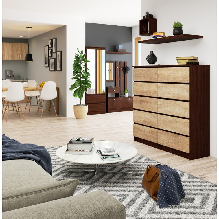 Jednoduchá a moderní komoda K120 10SZ. Je vyrobená z pevné laminované desky, která je odolná proti oděru a poškození. Univerzální vzhled splní očekávání každého, kdo ocení kombinaci jednoduchosti a elegance. Bezúchytková čela zásuvek zajišťují pohodlné používání.