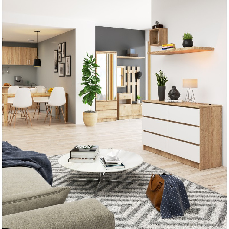 Jednoduchá a moderní komoda K120 6SZ. Je vyrobená z pevné laminované desky, která je odolná proti oděru a poškození. Univerzální vzhled splní očekávání každého, kdo ocení kombinaci jednoduchosti a elegance. Bezúchytková čela zásuvek zajišťují pohodlné používání.