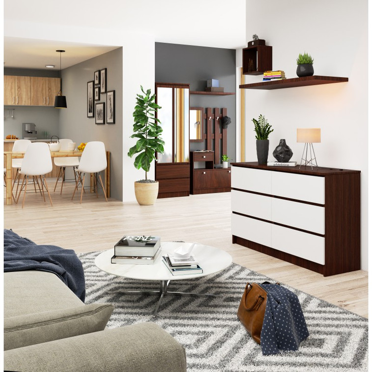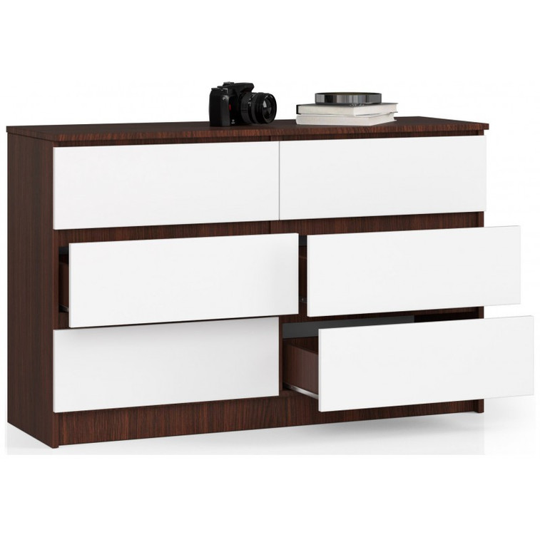 Jednoduchá a moderní komoda K120 6SZ. Je vyrobená z pevné laminované desky, která je odolná proti oděru a poškození. Univerzální vzhled splní očekávání každého, kdo ocení kombinaci jednoduchosti a elegance. Bezúchytková čela zásuvek zajišťují pohodlné používání.