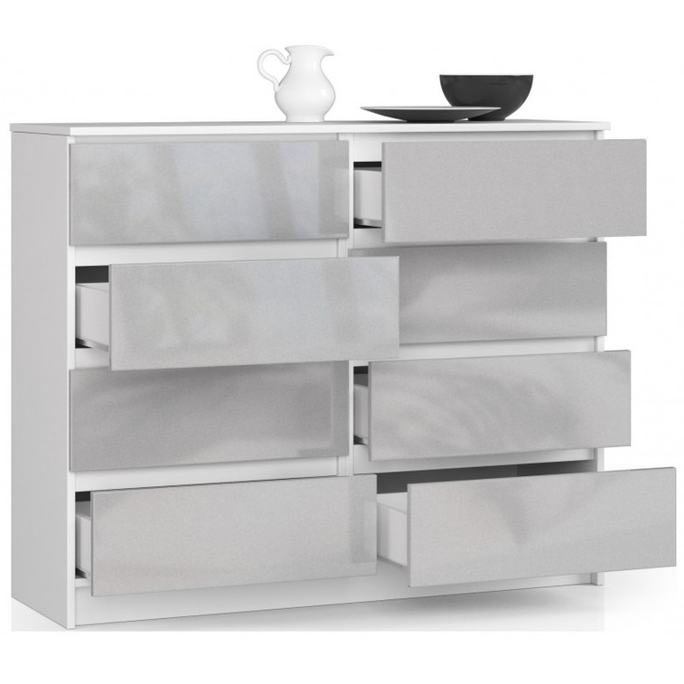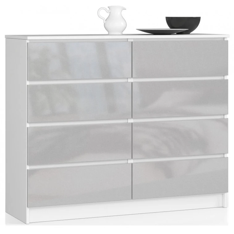Jednoduchá a moderní komoda K120 8SZ. Je vyrobená z pevné laminované desky, která je odolná proti oděru a poškození. Univerzální vzhled splní očekávání každého, kdo ocení kombinaci jednoduchosti a elegance. Bezúchytková čela zásuvek zajišťují pohodlné používání.