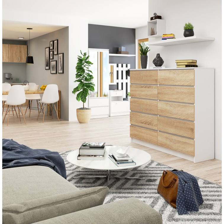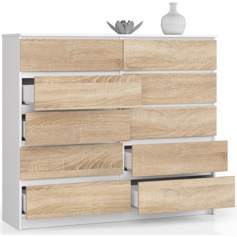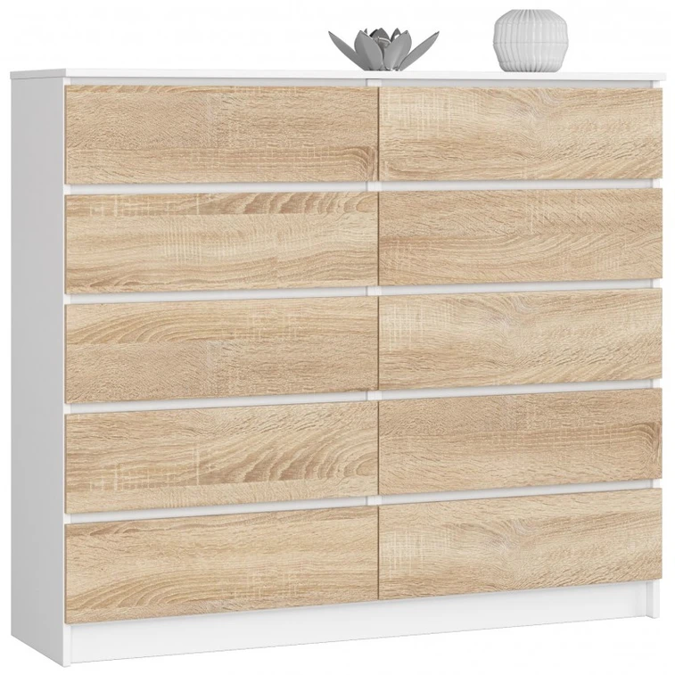 Jednoduchá a moderní komoda K140 10SZ. Je vyrobená z pevné laminované desky, která je odolná proti oděru a poškození. Univerzální vzhled splní očekávání každého, kdo ocení kombinaci jednoduchosti a elegance. Bezúchytková čela zásuvek zajišťují pohodlné používání.