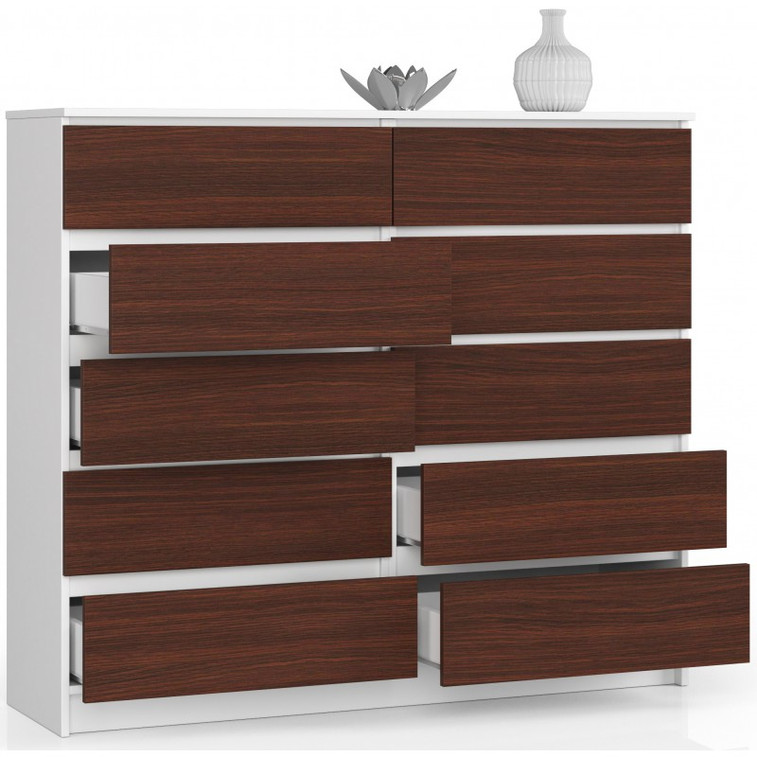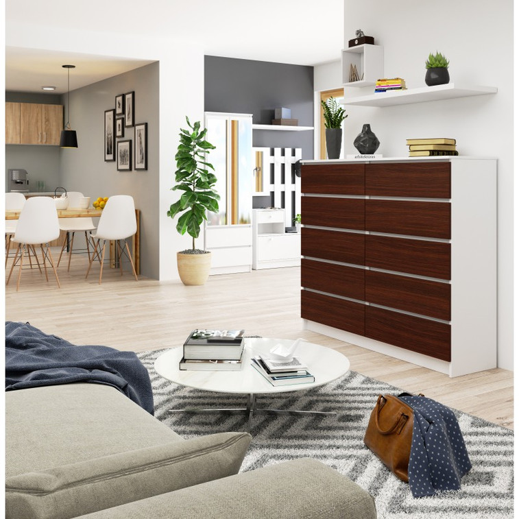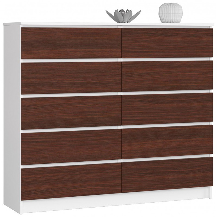 Jednoduchá a moderní komoda K140 10SZ. Je vyrobená z pevné laminované desky, která je odolná proti oděru a poškození. Univerzální vzhled splní očekávání každého, kdo ocení kombinaci jednoduchosti a elegance. Bezúchytková čela zásuvek zajišťují pohodlné používání.