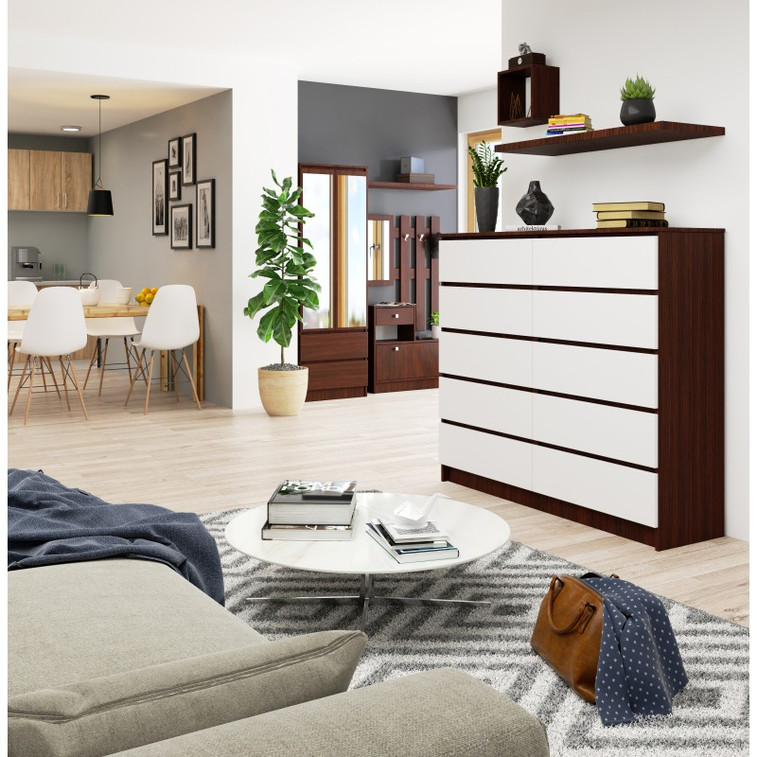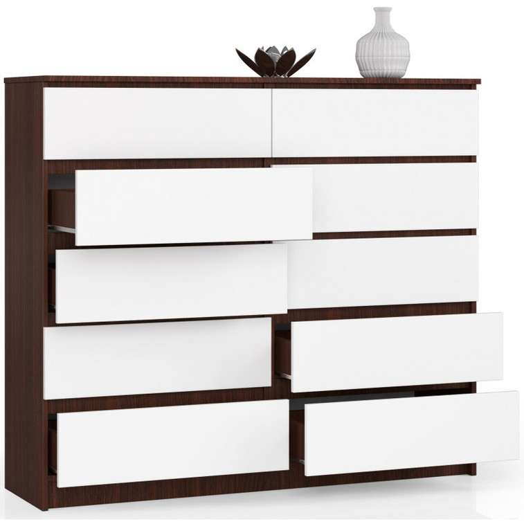 Jednoduchá a moderní komoda K140 10SZ. Je vyrobená z pevné laminované desky, která je odolná proti oděru a poškození. Univerzální vzhled splní očekávání každého, kdo ocení kombinaci jednoduchosti a elegance. Bezúchytková čela zásuvek zajišťují pohodlné používání.