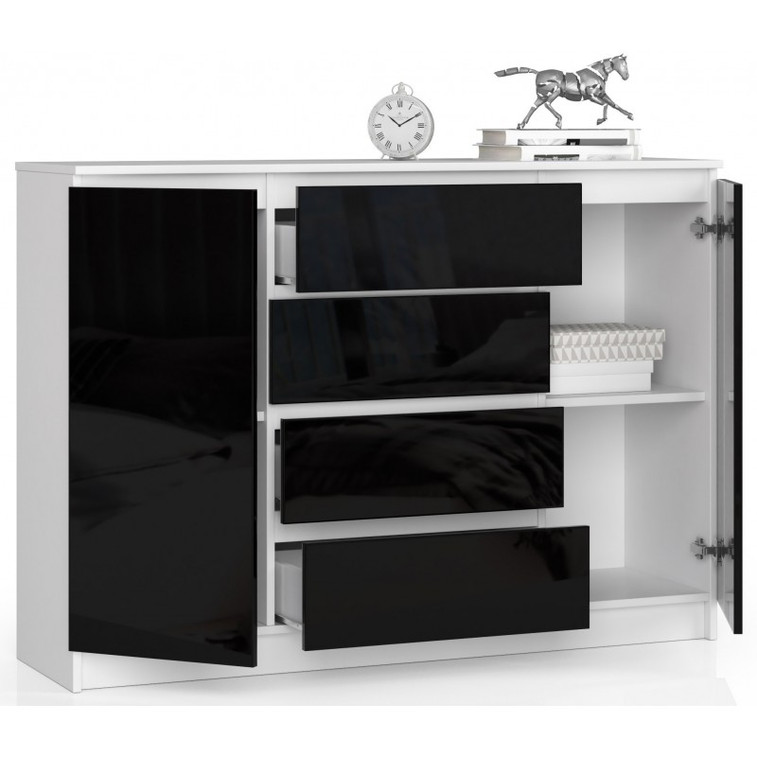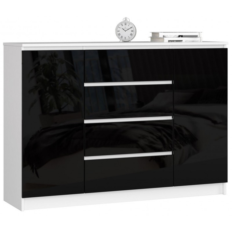 Jednoduchá a moderní komoda K140 2D4SZ. Je vyrobená z pevné laminované desky, která je odolná proti oděru a poškození. Univerzální vzhled splní očekávání každého, kdo ocení kombinaci jednoduchosti a elegance.