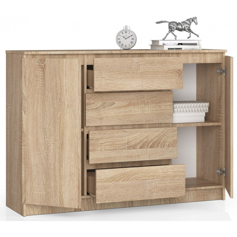Jednoduchá a moderní komoda K140 2D4SZ. Je vyrobená z pevné laminované desky, která je odolná proti oděru a poškození. Univerzální vzhled splní očekávání každého, kdo ocení kombinaci jednoduchosti a elegance. Bezúchytková čela zásuvek zajišťují pohodlné používání.