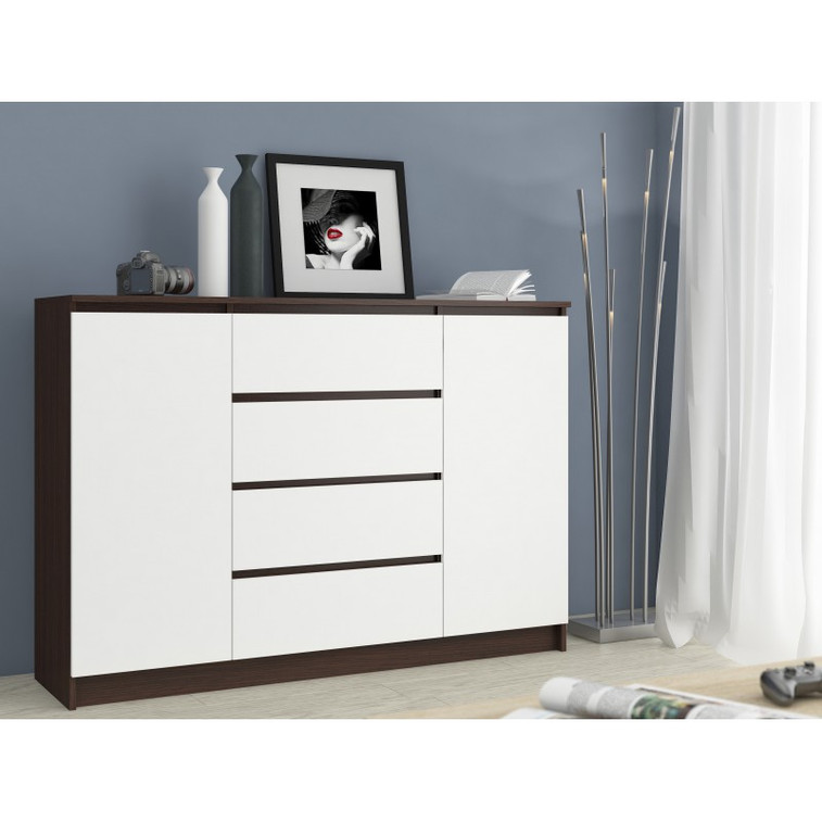 Jednoduchá a moderní komoda K140 2D4SZ. Je vyrobená z pevné laminované desky, která je odolná proti oděru a poškození. Univerzální vzhled splní očekávání každého, kdo ocení kombinaci jednoduchosti a elegance. Bezúchytková čela zásuvek zajišťují pohodlné používání.