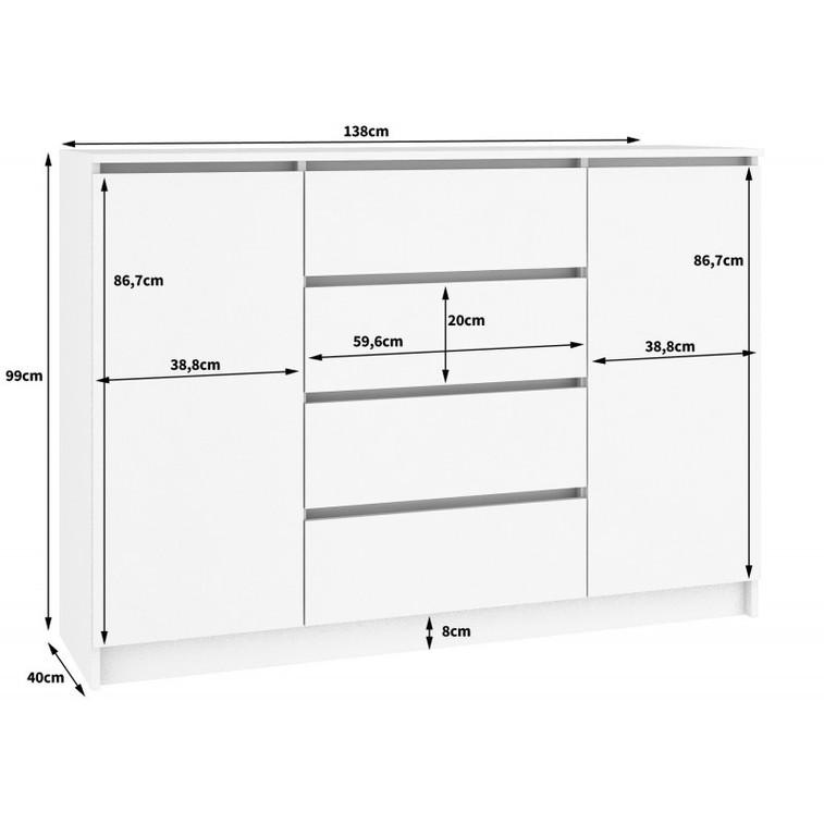 Jednoduchá a moderní komoda K140 2D4SZ. Je vyrobená z pevné laminované desky, která je odolná proti oděru a poškození. Univerzální vzhled splní očekávání každého, kdo ocení kombinaci jednoduchosti a elegance. Bezúchytková čela zásuvek zajišťují pohodlné používání.