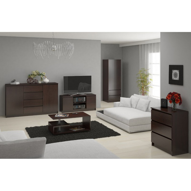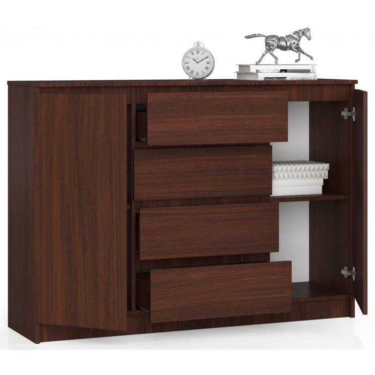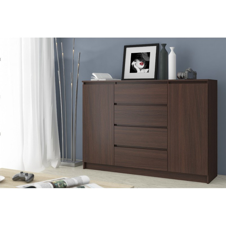 Jednoduchá a moderní komoda K140 2D4SZ. Je vyrobená z pevné laminované desky, která je odolná proti oděru a poškození. Univerzální vzhled splní očekávání každého, kdo ocení kombinaci jednoduchosti a elegance. Bezúchytková čela zásuvek zajišťují pohodlné používání.