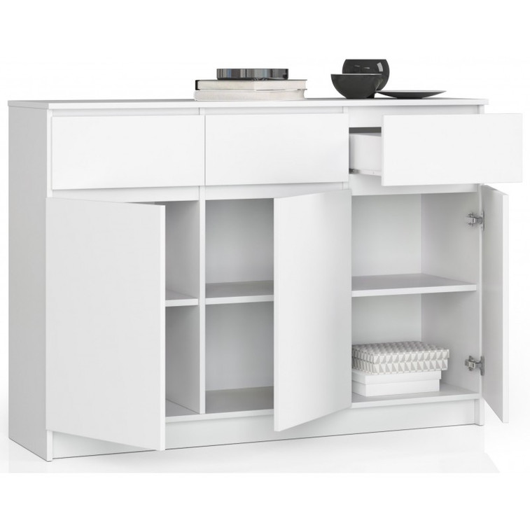 Jednoduchá a moderní komoda K140 3D3SZ. Je vyrobená z pevné laminované desky, která je odolná proti oděru a poškození. Univerzální vzhled splní očekávání každého, kdo ocení kombinaci jednoduchosti a elegance. Bezúchytková čela zásuvek zajišťují pohodlné používání.