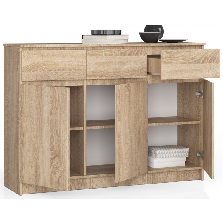 Jednoduchá a moderní komoda K140 3D3SZ. Je vyrobená z pevné laminované desky, která je odolná proti oděru a poškození. Univerzální vzhled splní očekávání každého, kdo ocení kombinaci jednoduchosti a elegance. Bezúchytková čela zásuvek zajišťují pohodlné používání.