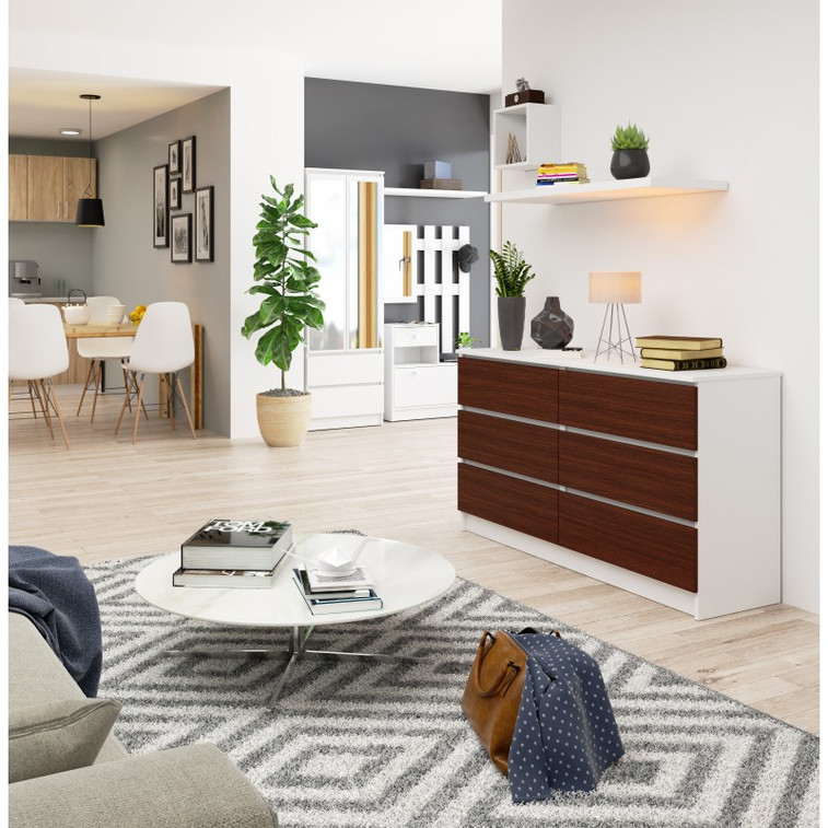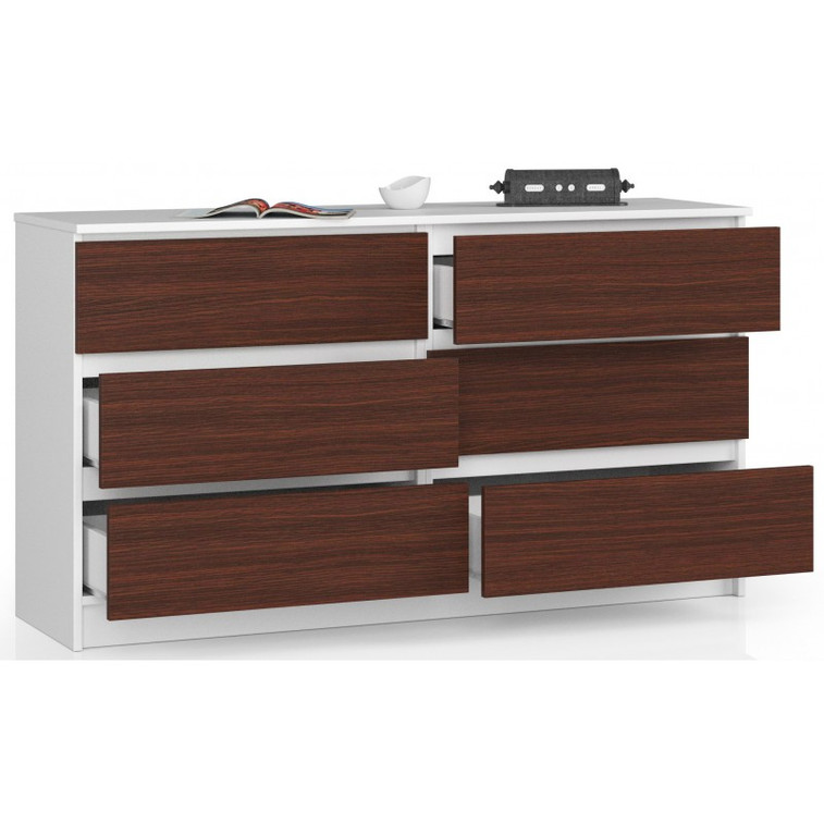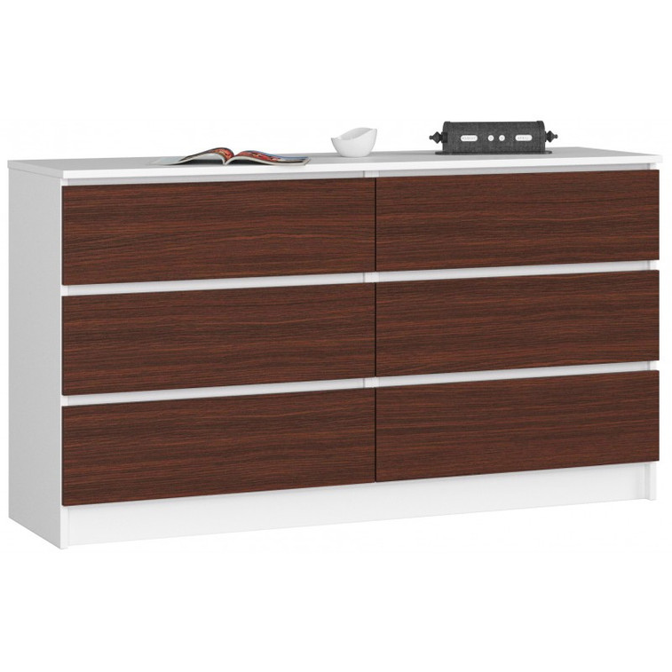 Jednoduchá a moderní komoda K140 6SZ. Je vyrobená z pevné laminované desky, která je odolná proti oděru a poškození. Univerzální vzhled splní očekávání každého, kdo ocení kombinaci jednoduchosti a elegance. Bezúchytková čela zásuvek zajišťují pohodlné používání.