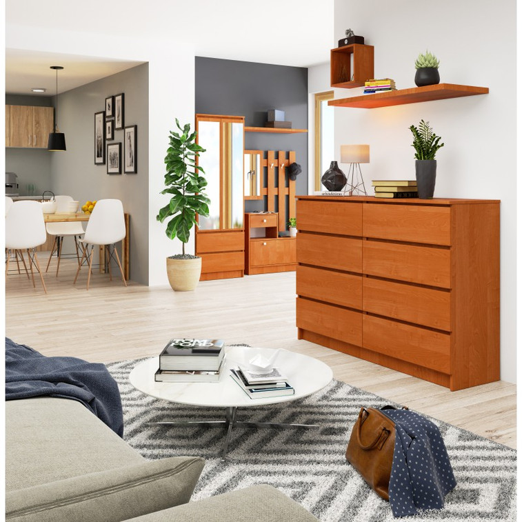 Jednoduchá a moderní komoda K140 8SZ. Je vyrobená z pevné laminované desky, která je odolná proti oděru a poškození. Univerzální vzhled splní očekávání každého, kdo ocení kombinaci jednoduchosti a elegance. Bezúchytková čela zásuvek zajišťují pohodlné používání.