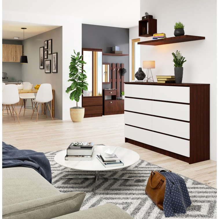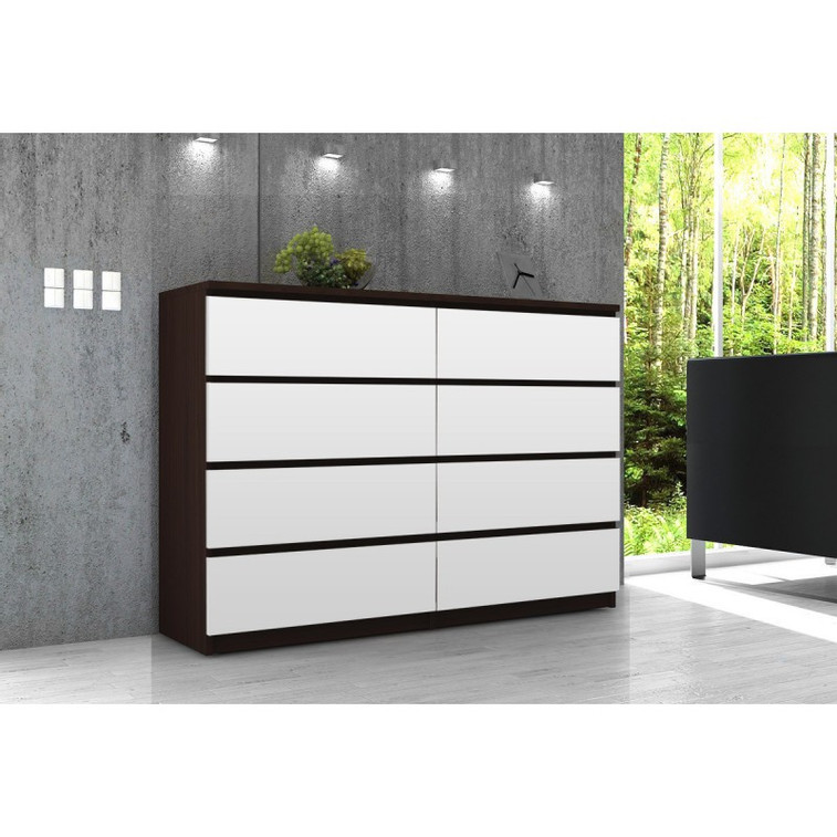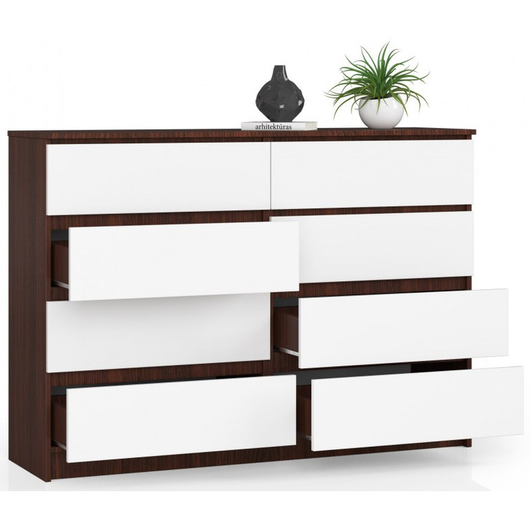 Jednoduchá a moderní komoda K140 8SZ. Je vyrobená z pevné laminované desky, která je odolná proti oděru a poškození. Univerzální vzhled splní očekávání každého, kdo ocení kombinaci jednoduchosti a elegance. Bezúchytková čela zásuvek zajišťují pohodlné používání.